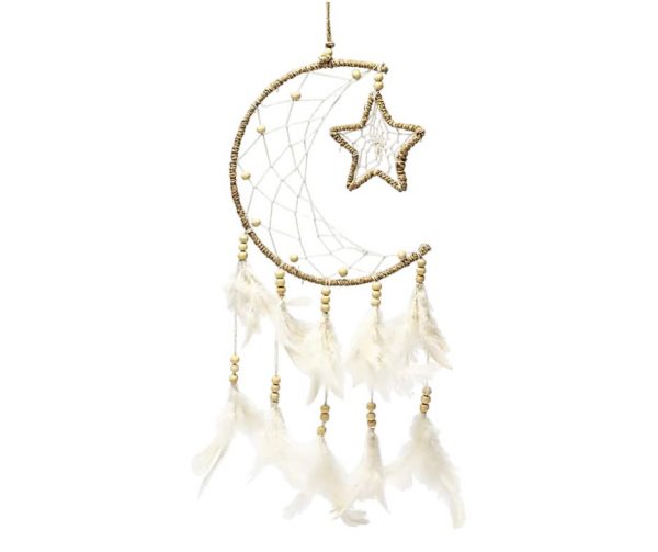 Transformez votre intérieur en un espace apaisant avec cet attrape-rêves artisanal en forme de lune et étoile, réalisé en chanvre naturel et plumes blanches.