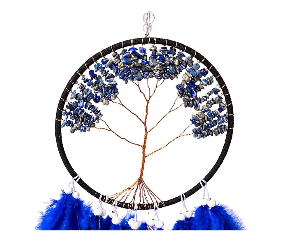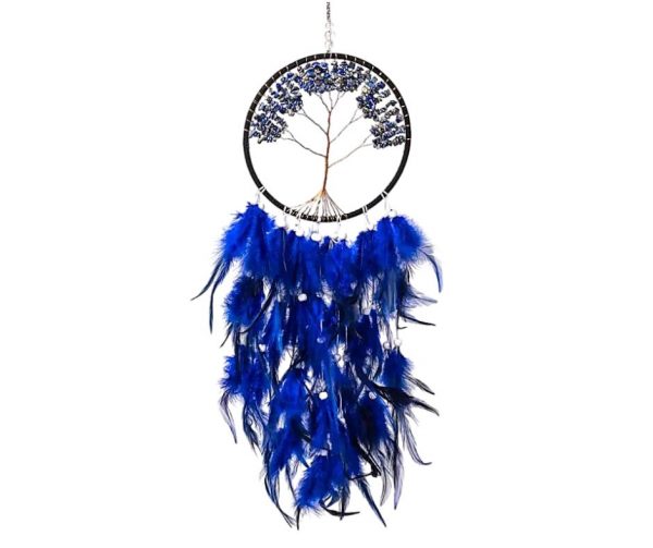 Sublimez votre intérieur avec ce capteur de rêves artisanal représentant un Arbre de Vie en pierres naturelles. Ses plumes bleues profondes, douces et légères, apportent une touche d’élégance et de sérénité.