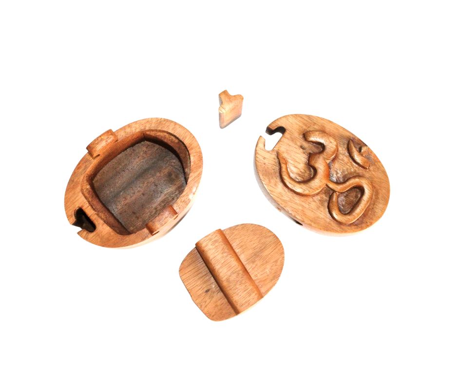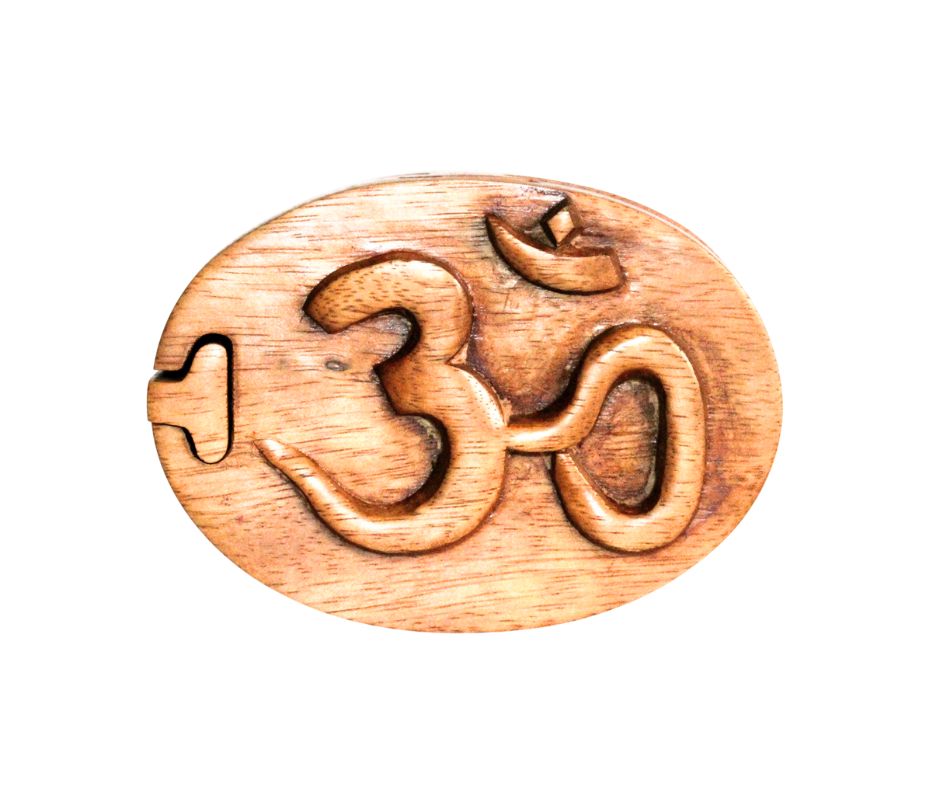 Plongez dans la sérénité avec cette boîte puzzle en bois de suar sculptée du symbole sacré Om (ॐ).