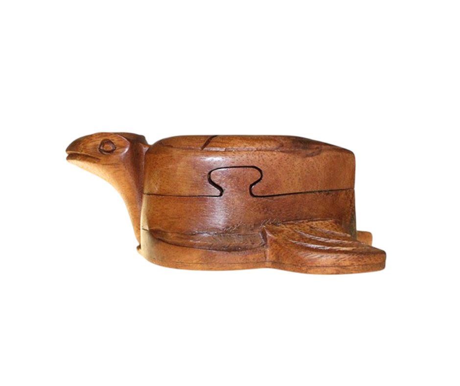 Découvrez l’originalité et le charme de cette boîte puzzle en bois de Suar sculptée en forme de tortue.