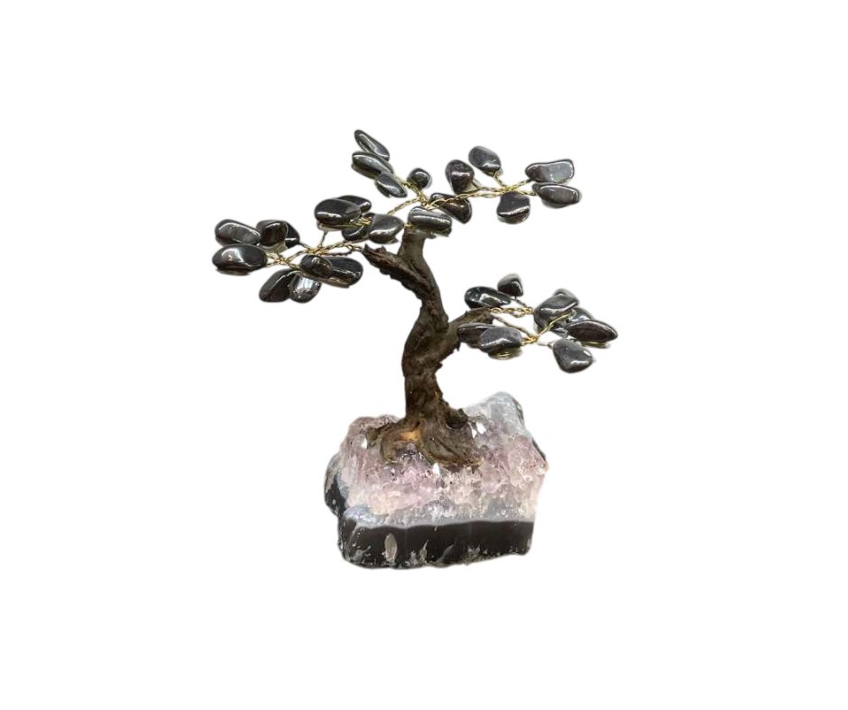 Ce bonsaï orné de feuilles en hématite naturelle diffuse une énergie d’ancrage, de concentration et de stabilité mentale. L’hématite est une pierre puissante de protection énergétique et de renforcement du mental, idéale pour garder les pieds sur terre tout en avançant avec assurance.