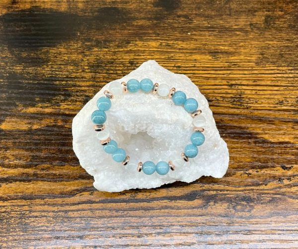 Parce qu’il unit la pureté lumineuse de la Sélénite à la fluidité apaisante de l’Aigue-Marine, ce bracelet est un allié précieux pour ceux qui cherchent la paix du cœur et de l’esprit