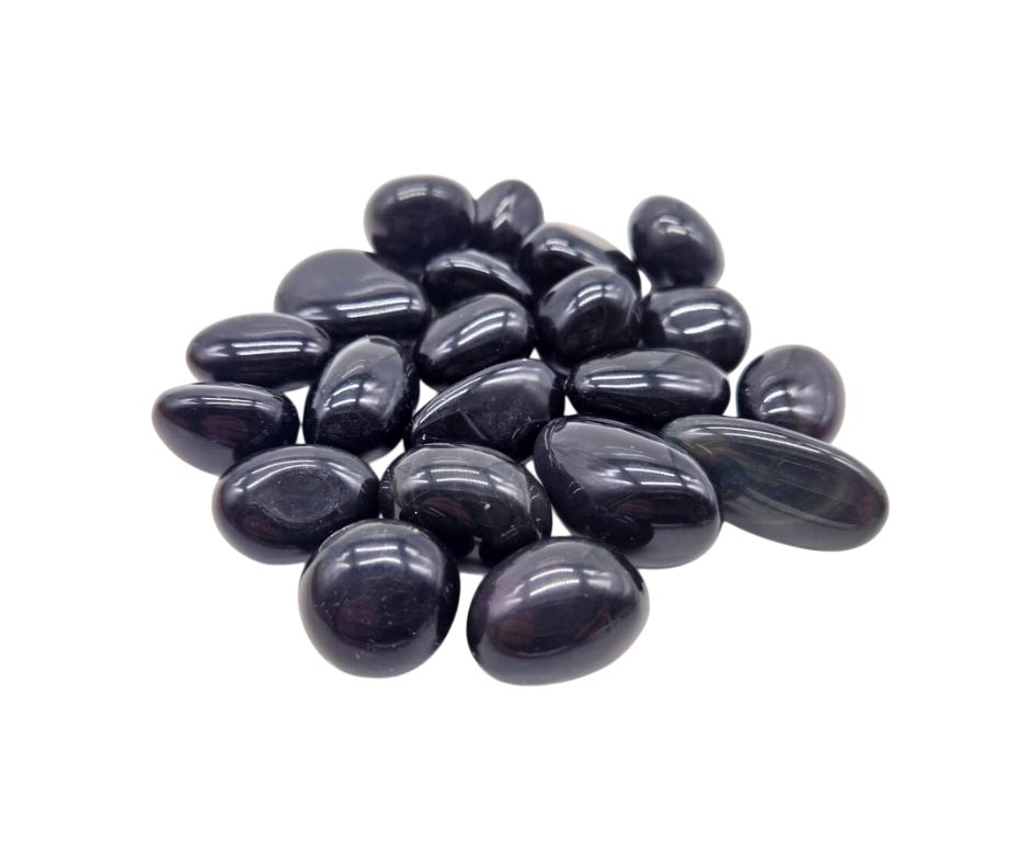 Ses reflets profonds et irisés, visibles sous la lumière, symbolisent l’accès à une compréhension plus vaste de soi-même. En pierre roulée, elle peut être portée sur soi ou utilisée lors de moments d’introspection et de recentrage.